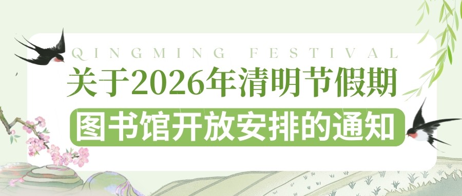 各位读者:根据学校清明节放假安排的文件精神,结合我馆实际, 清明节假期期间,图书馆开放安排如下:西校区图书馆:4月4日-4月6日正常开放,开放时间为8:00-17:30。东校区图…