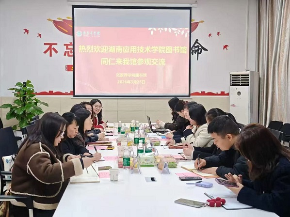 参观结束后,召开了专题交流座谈会。会上,张家界学院图书馆副馆长刘欢详细介绍了该馆基本概况。张家界学院图书馆馆藏资源丰富、学科门类齐全,建有 “武陵风骨文献资料中心”“名家书屋”“武陵山区地方文献室”等特色文献资源库,内设多个职能部门。同时与张家界市图书馆达成共建共享合作,实现资源优势互补。随后,综合办公室主任崔伶竹分享了阅读推广工作的宝贵经验,重点阐述了在学校领导高度重视下,联动多部门、各学院及学生社团,整合校内外宣传资源,结合地方特色开展多元化阅读活动,切实提升师生素养的实践路径。副馆长黄晓燕则围绕数字资源建设与推广利用展开讲解,介绍了特色文献资源的建设成果,分享了学科服务开展过程中遇到的困难,并详细说明通过建立专项服务群、定期推送资源信息等方式破解服务难题的具体举措。