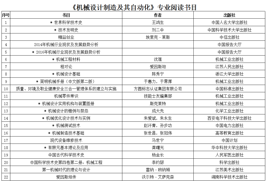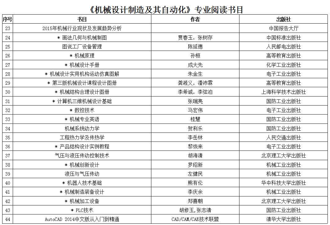 本科学生阅读书目—机电工程学院 (机械设计制造及其自动化)