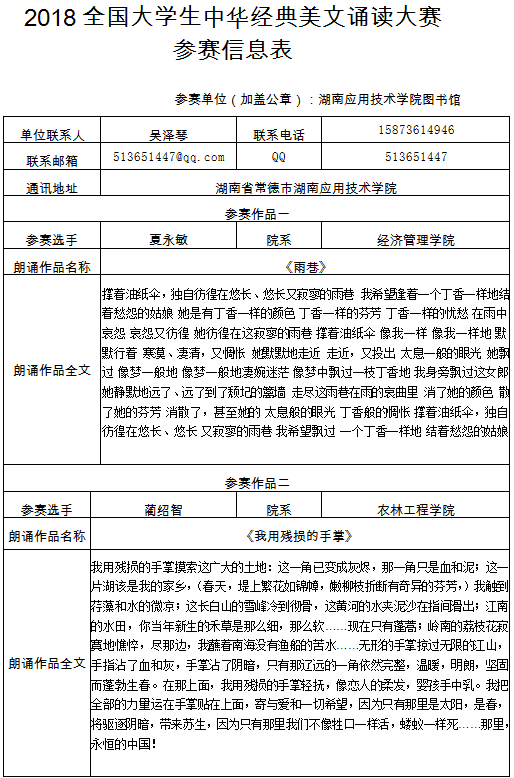湖南应用技术学院图书馆中华经典诵的参赛作品